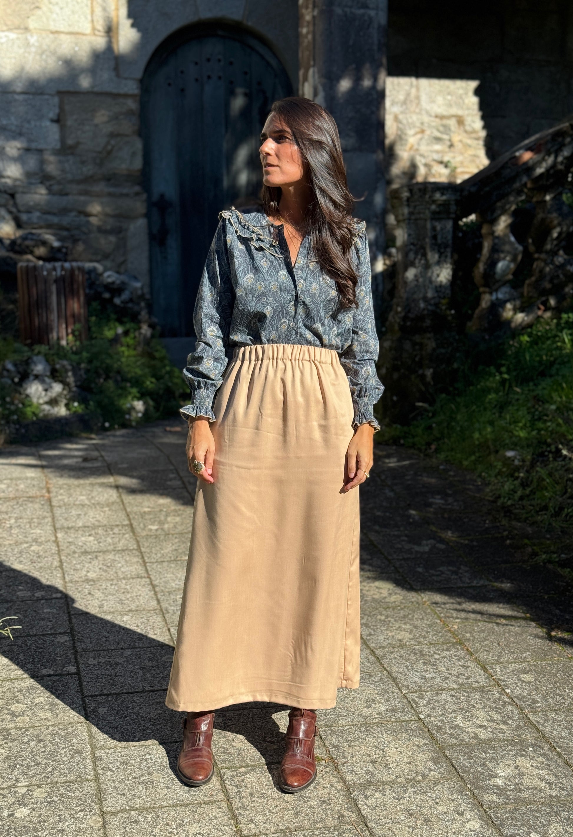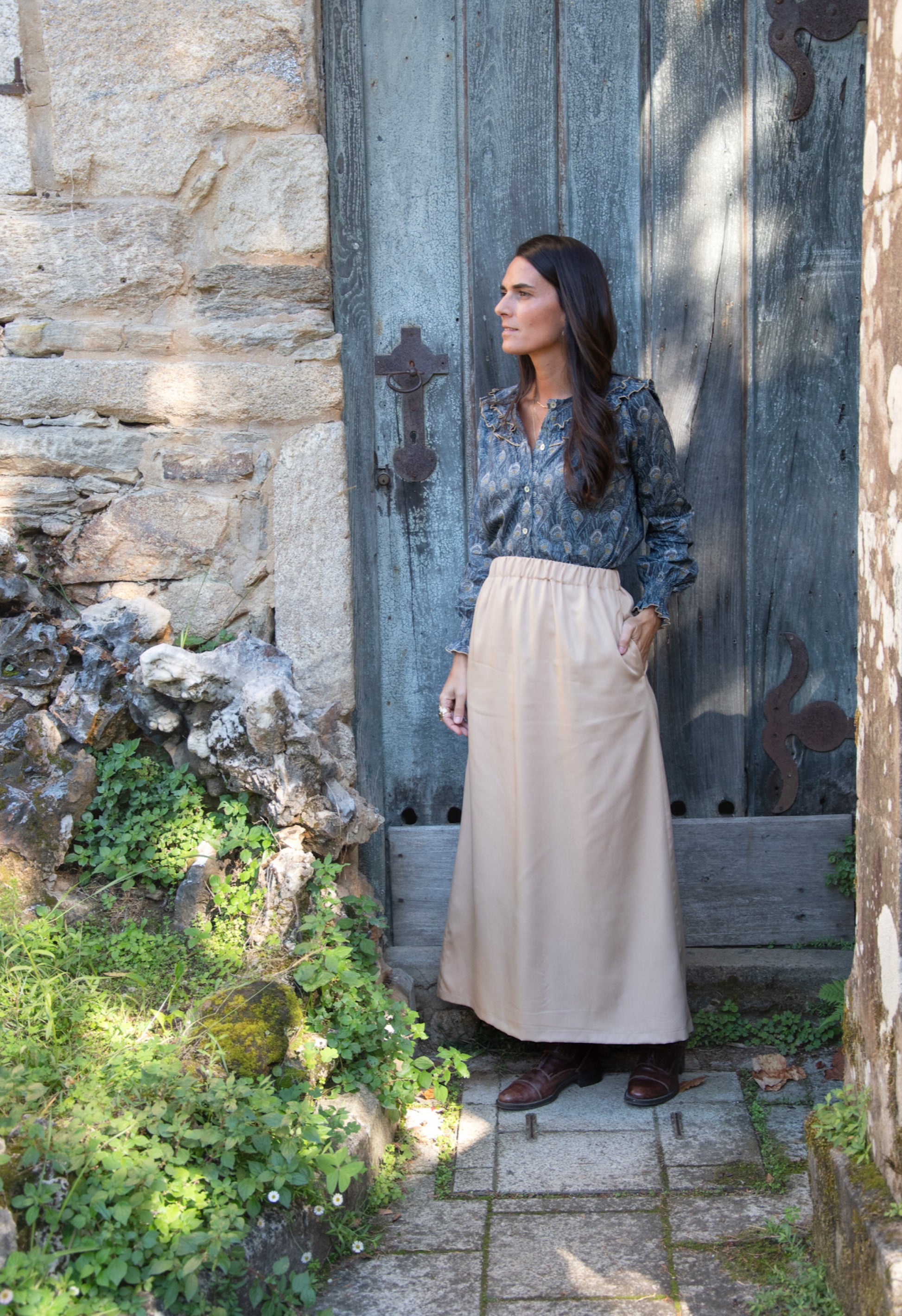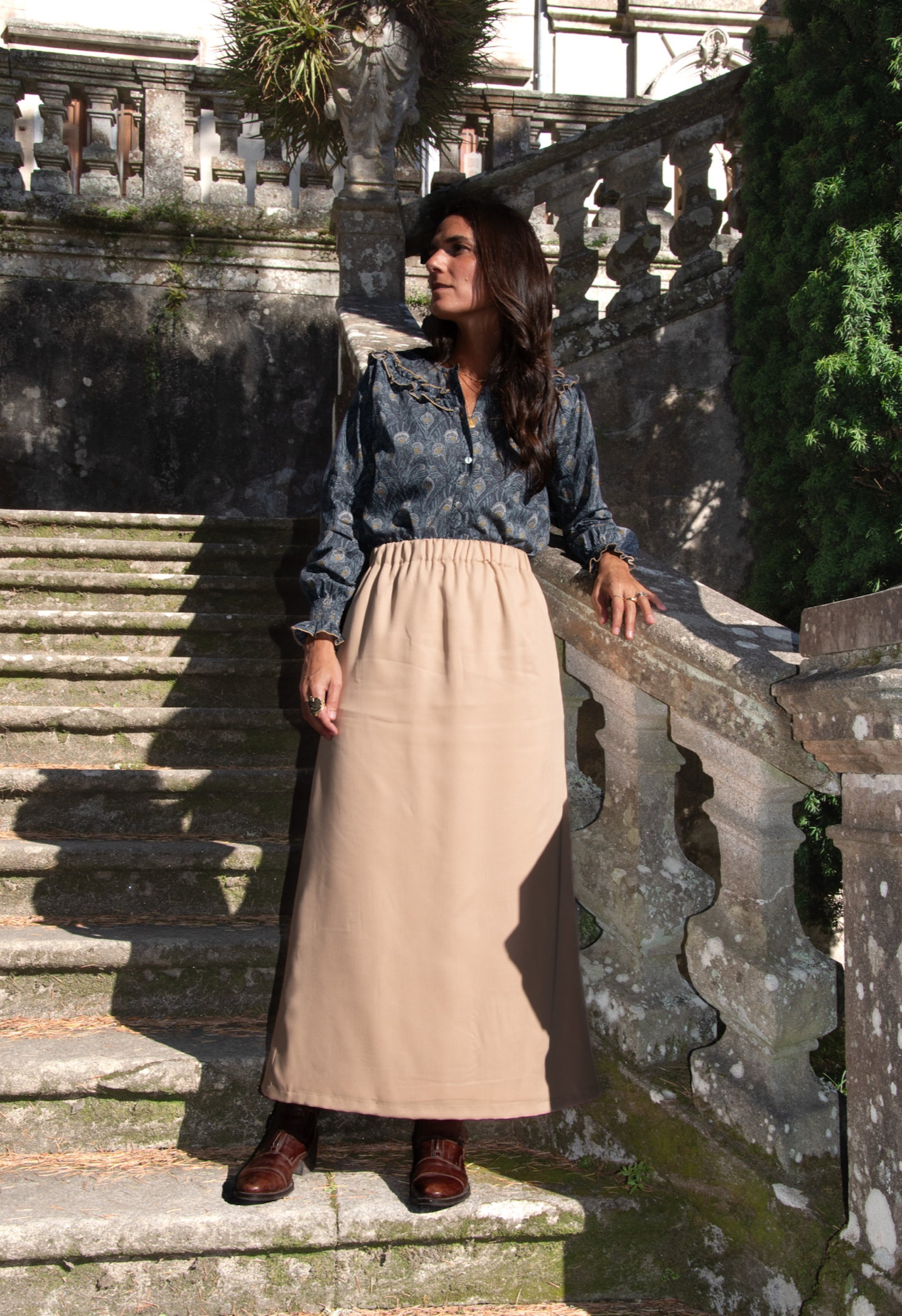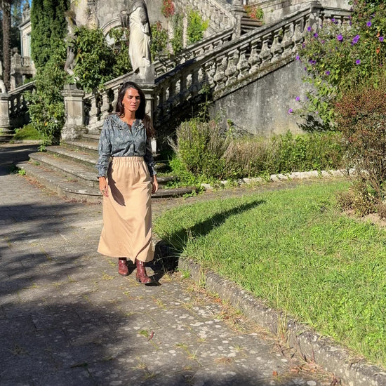 Chloè shirt made with Liberty London® Swirling Petals fabric, in our Atelier in Vigo, Galicia. Puffed sleeves, mother-of-pearl buttons, and a round neckline. It's very fresh, versatile, and has a wonderful feel.