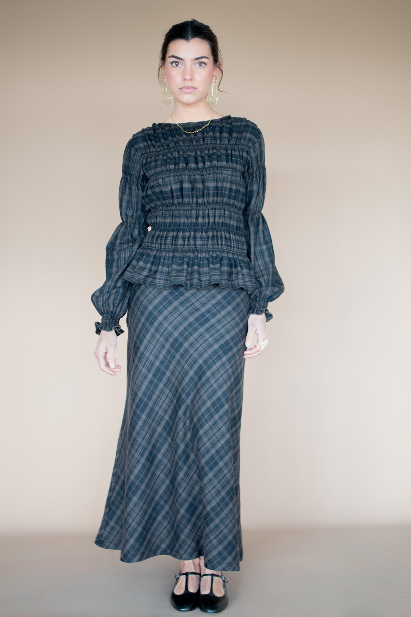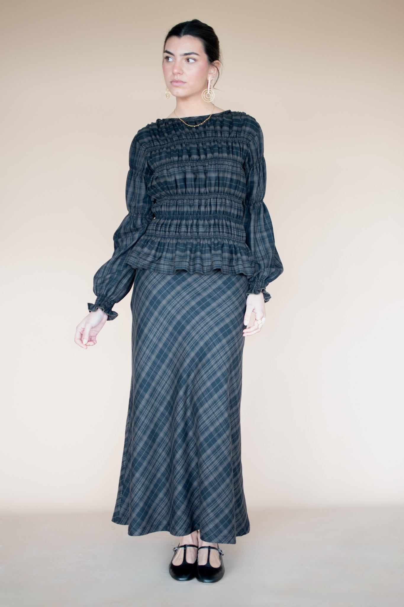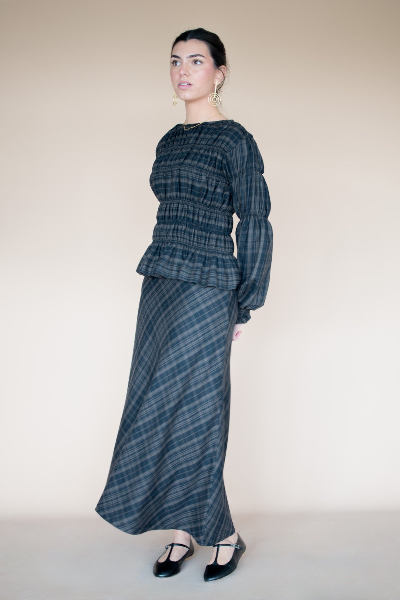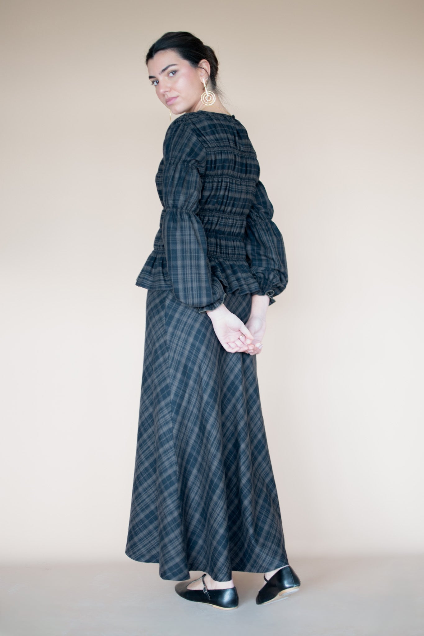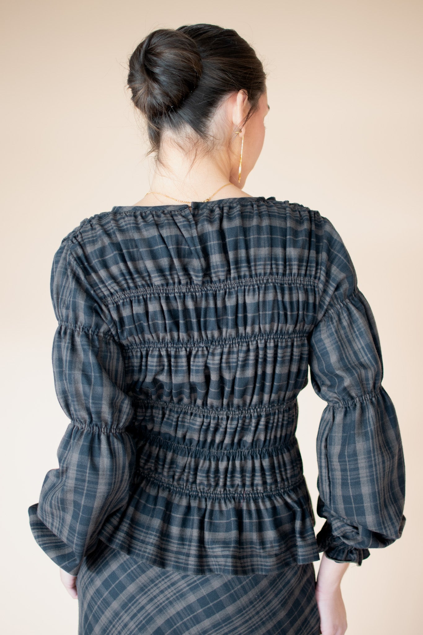 Chloè shirt made with Liberty London® Swirling Petals fabric, in our Atelier in Vigo, Galicia. Puffed sleeves, mother-of-pearl buttons, and a round neckline. It's very fresh, versatile, and has a wonderful feel.