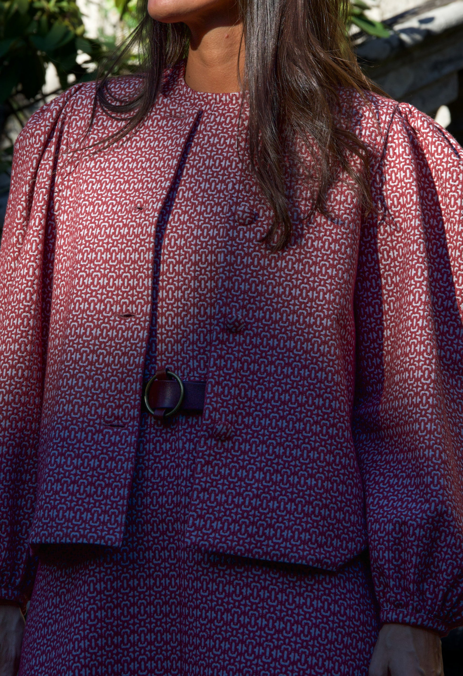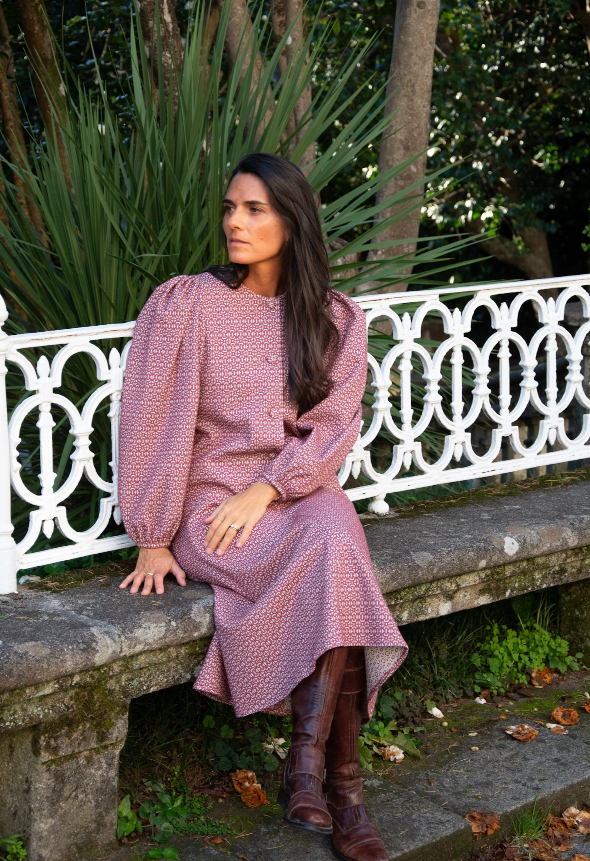 Isabelle dress in shades of pink, made in our Atelier in Vigo, with Liberty London® Paisley fabric.