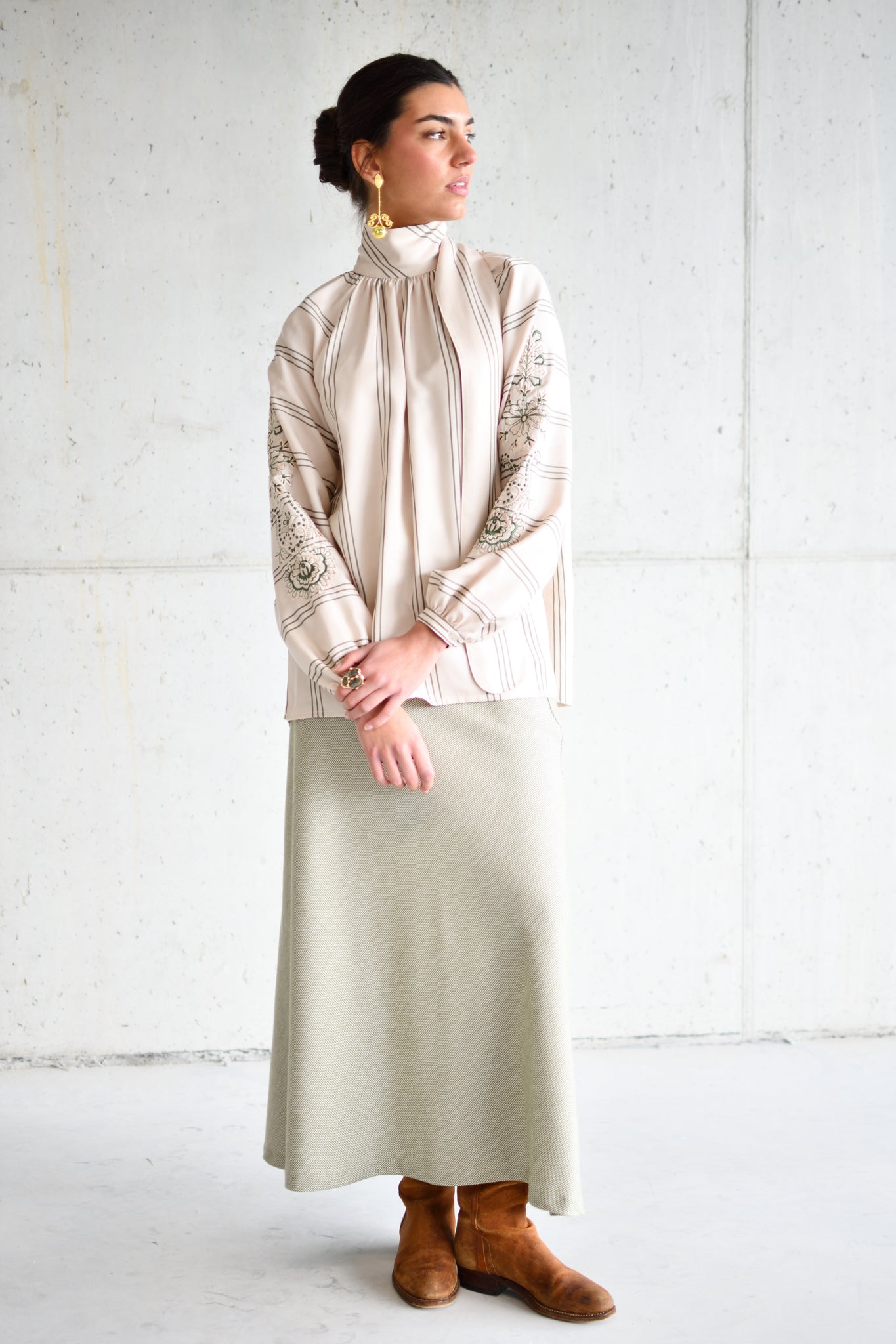 The Charlotte tartan skirt, made with a bias cut in our Vigo Atelier, is crafted from organic rooster cotton in shades of green and beige—a very soft and warm fabric that lends a timeless, feminine style.