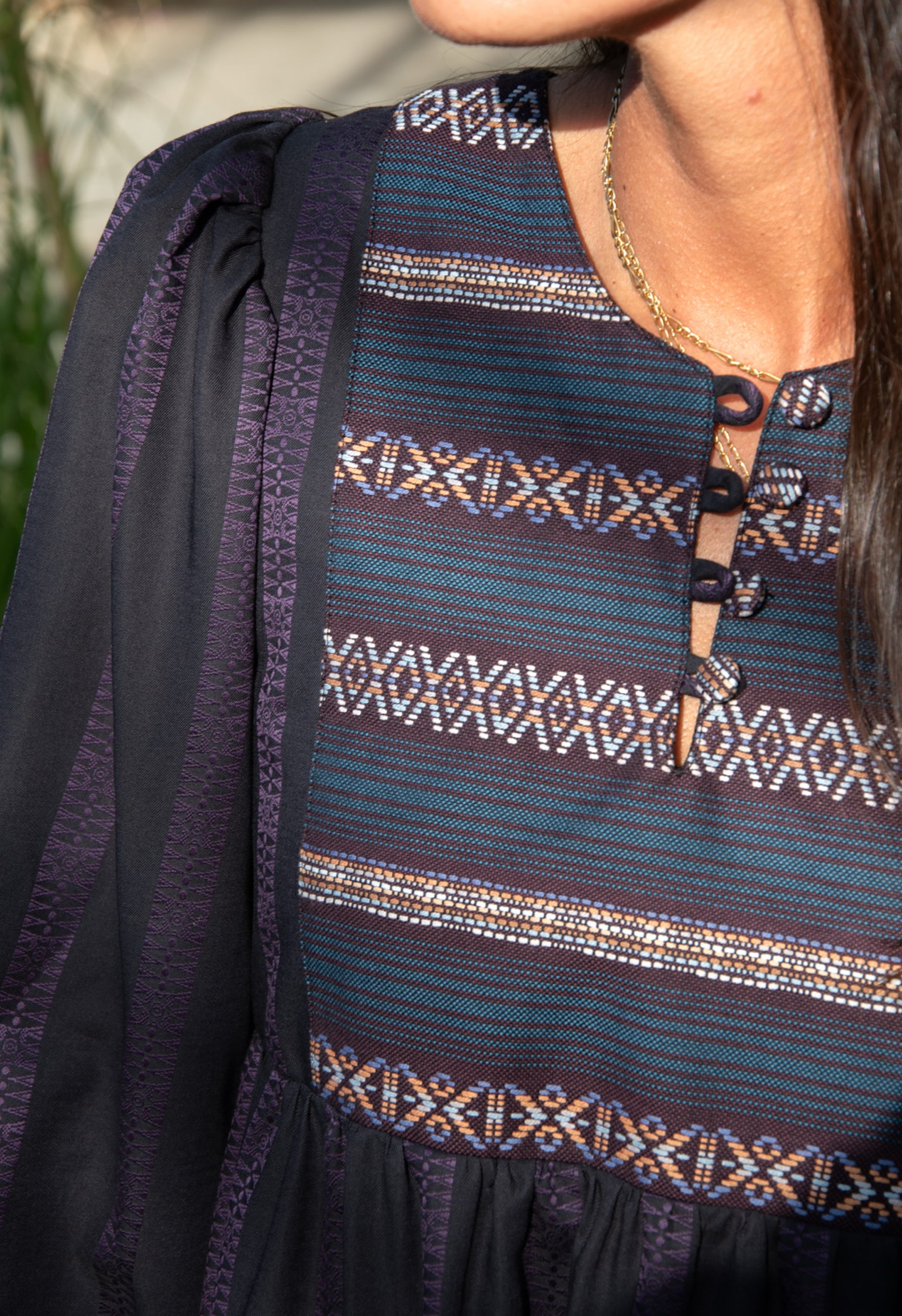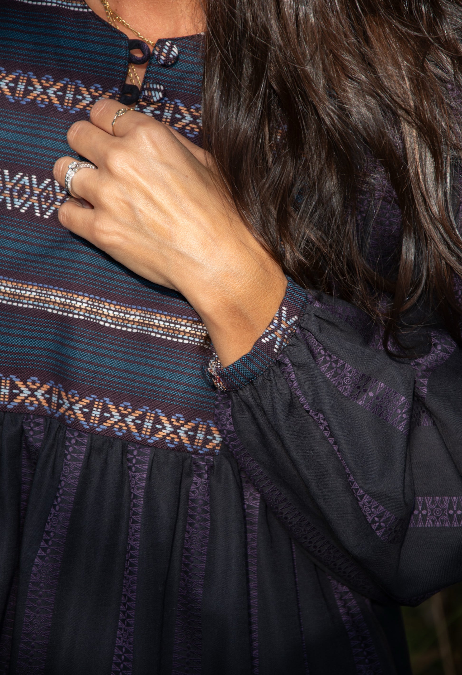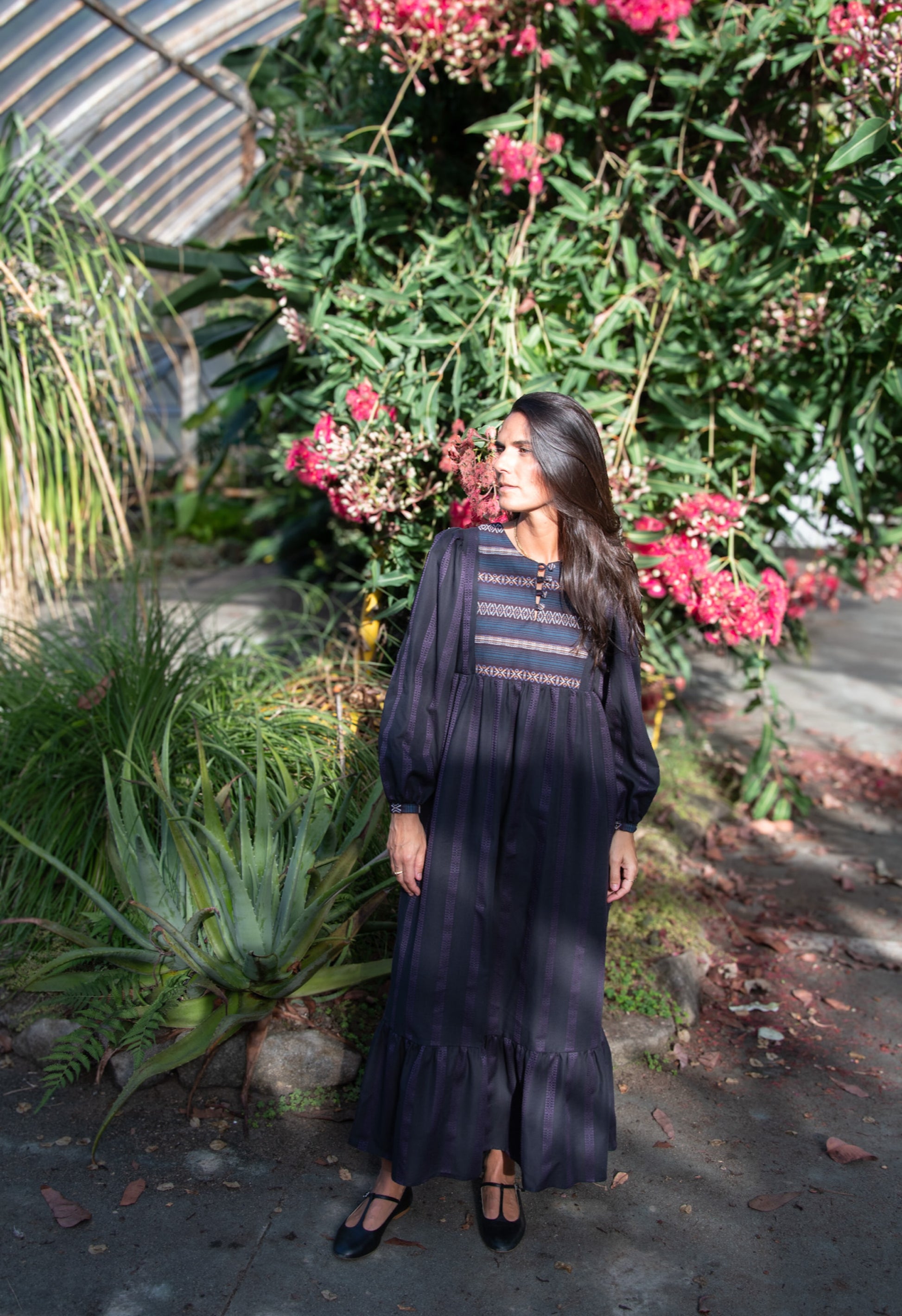 We present our Amelie dress with a green paisley print, made in our Vigo atelier with organic cotton fabric made in India.