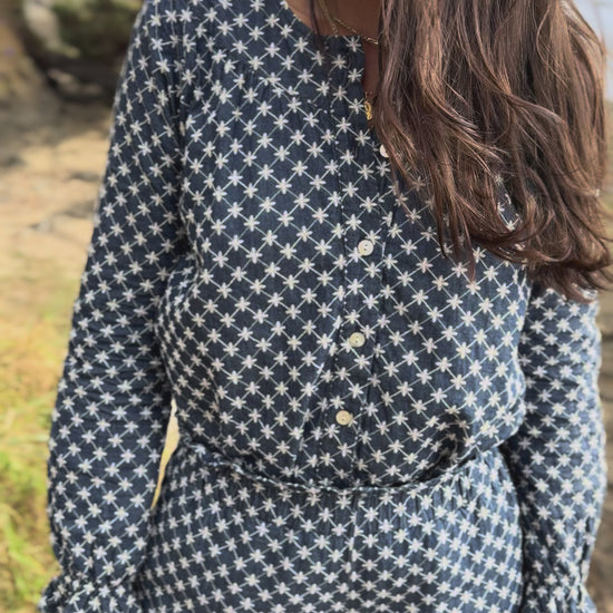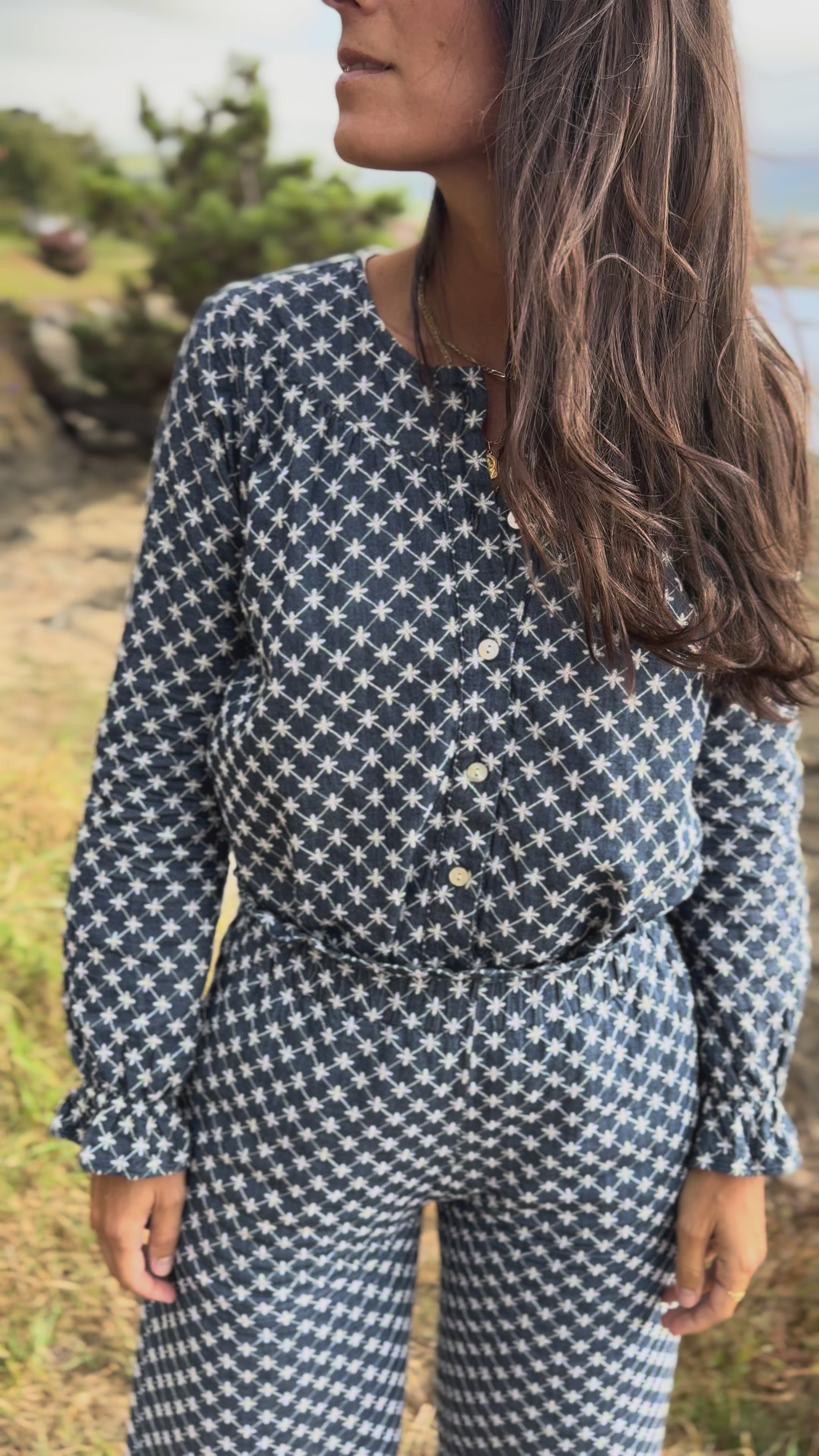 Pantalón modelo Fleur confeccionado en nuestros Atelier en Galicia con tejido denim con bordados. Cintura engomada con volante y bolsillos invisibles. Combínalo con la camisa Clarice denim con bordados como total look perfecto para cualquier época del año.