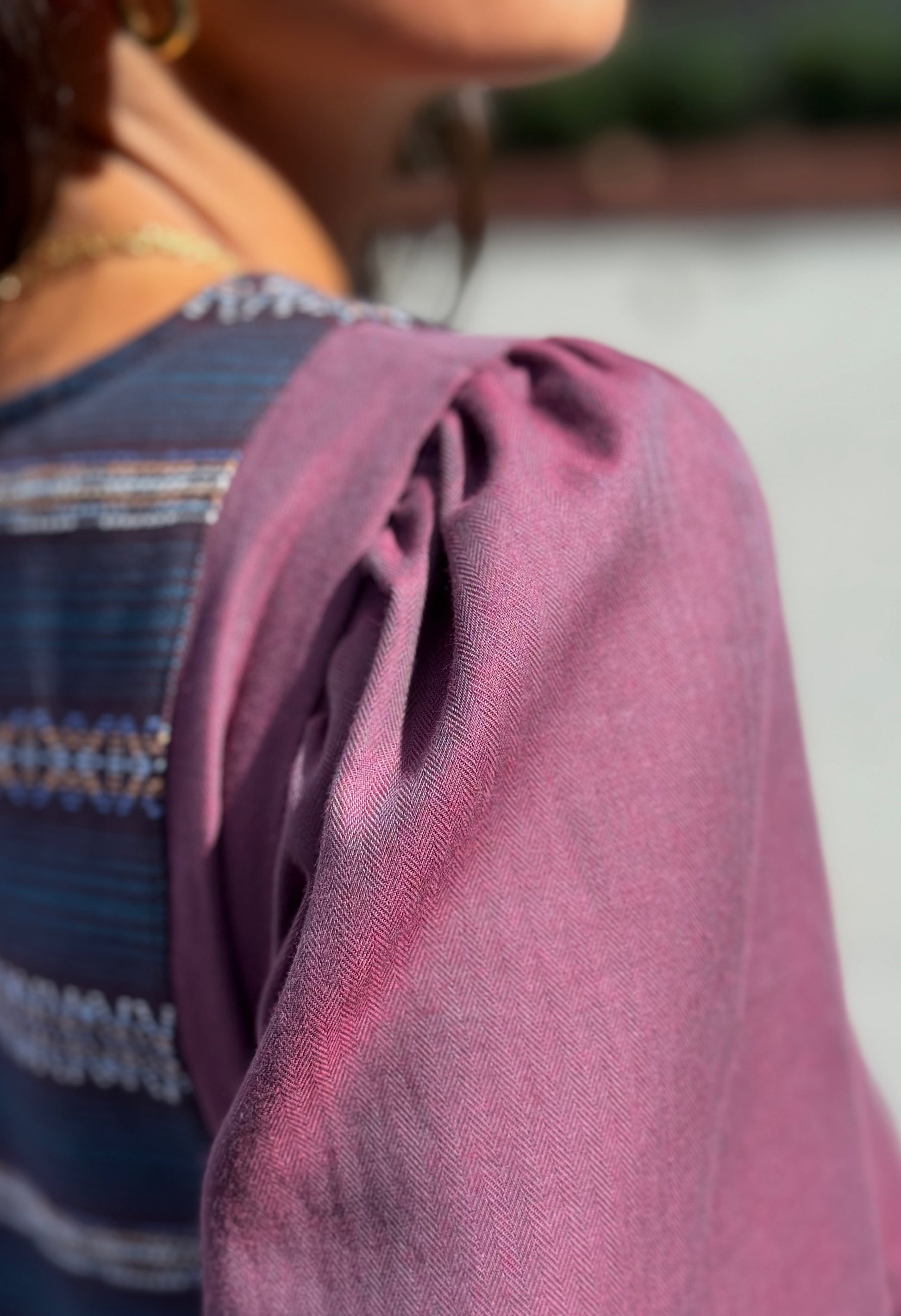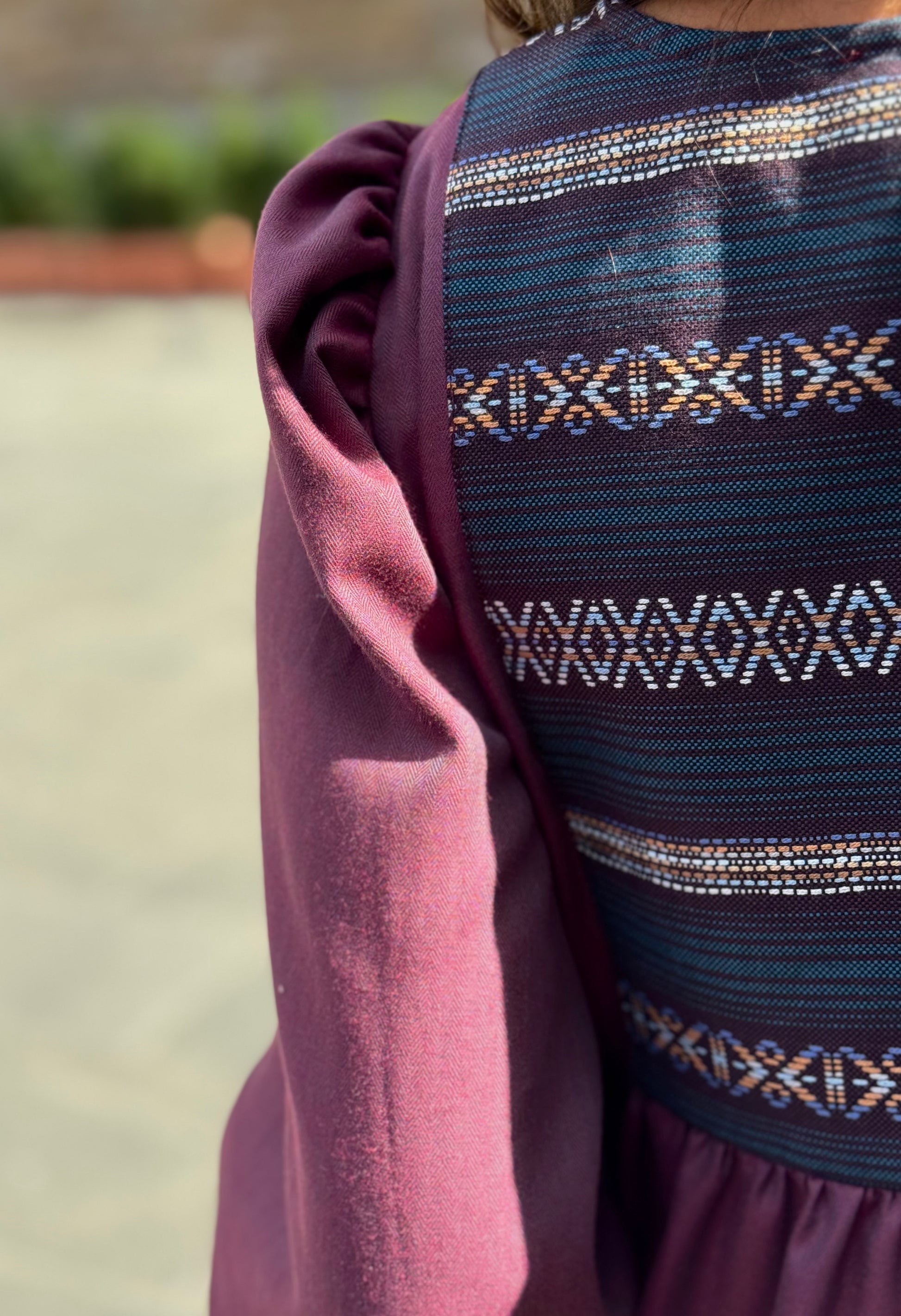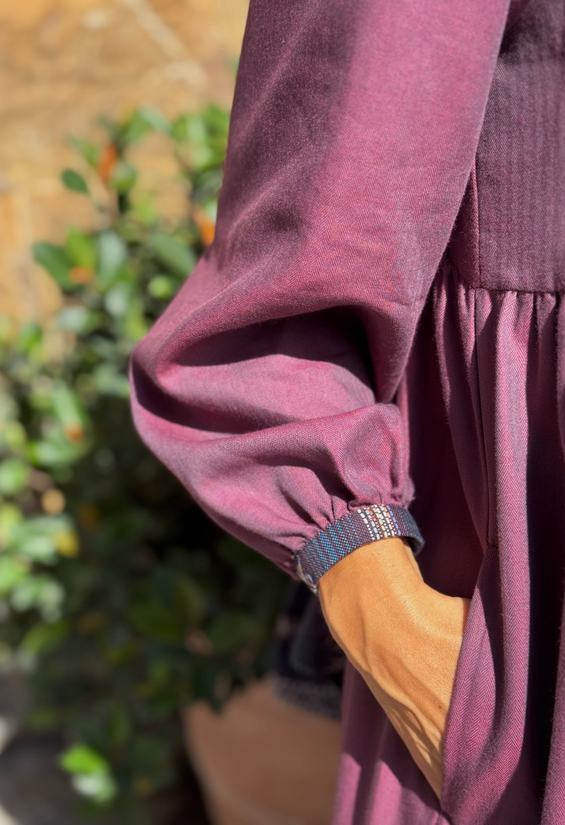 El vestido Alessandra, perfecto para el otoño, confeccionado en nuestro Atelier en Vigo, con tejido étnico bordado en tonos berenjena a contraste en el pecho, espalda y puños, combinado con un tejido de espiga burdeos con ligero brillo, que lo hace tan especial. Manga abullonada y bolsillos invisibles.