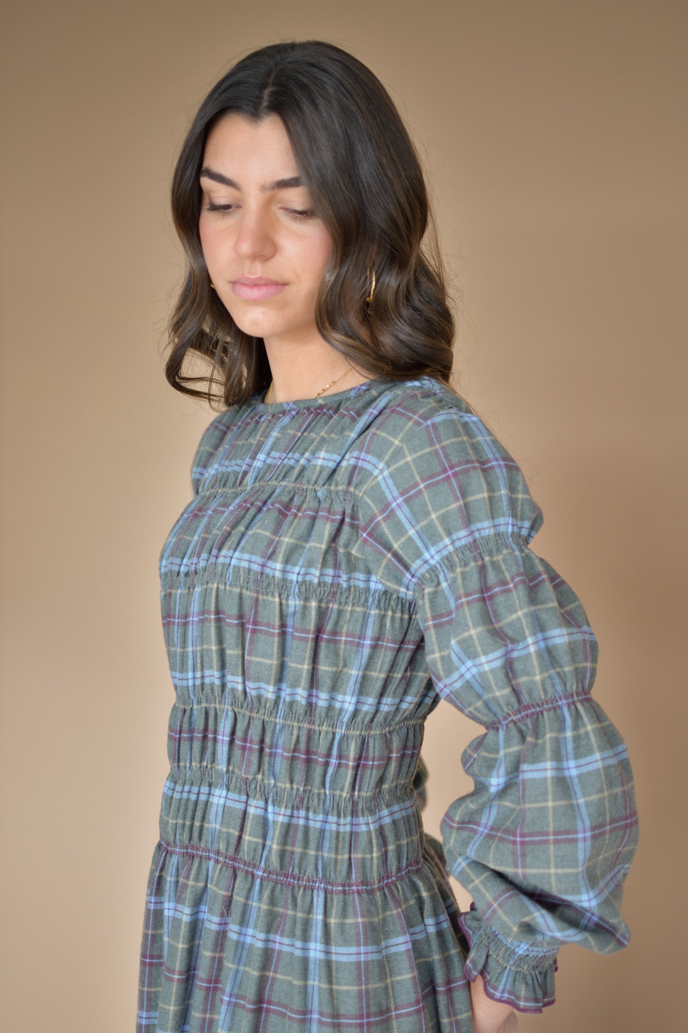 El cuerpo fruncido con gomas finas—un trabajo artesanal que requiere tiempo y precisión— se adapta con suavidad a la figura, realzándola sin presionar. Las mangas con volumen y el largo fluido, crean una silueta armoniosa, femenina y tremendamente favorecedora.
